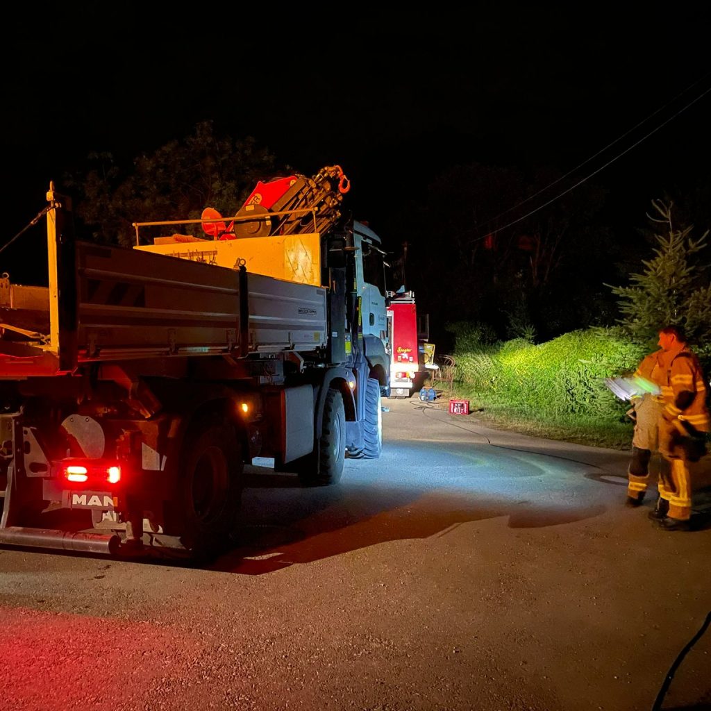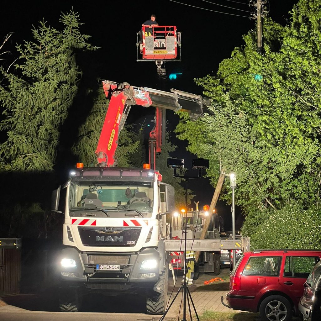 Durch Sturmböen wurde in Beutelreusch ein Strommast abgeknickt. Der Energieversorger wurde über die Leitstelle angefordert, um den Strom abzuschalten und die Leitung wieder zu reparieren.