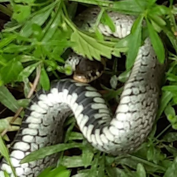Unbekannte Schlange im Garten stellte sich als Ringelnatter heraus.