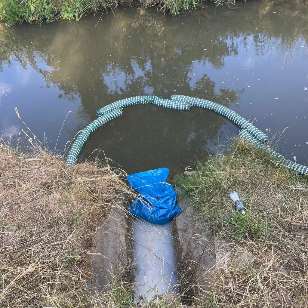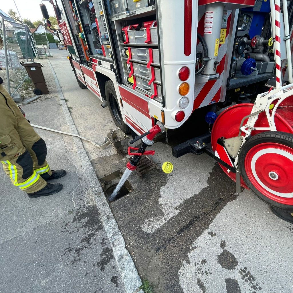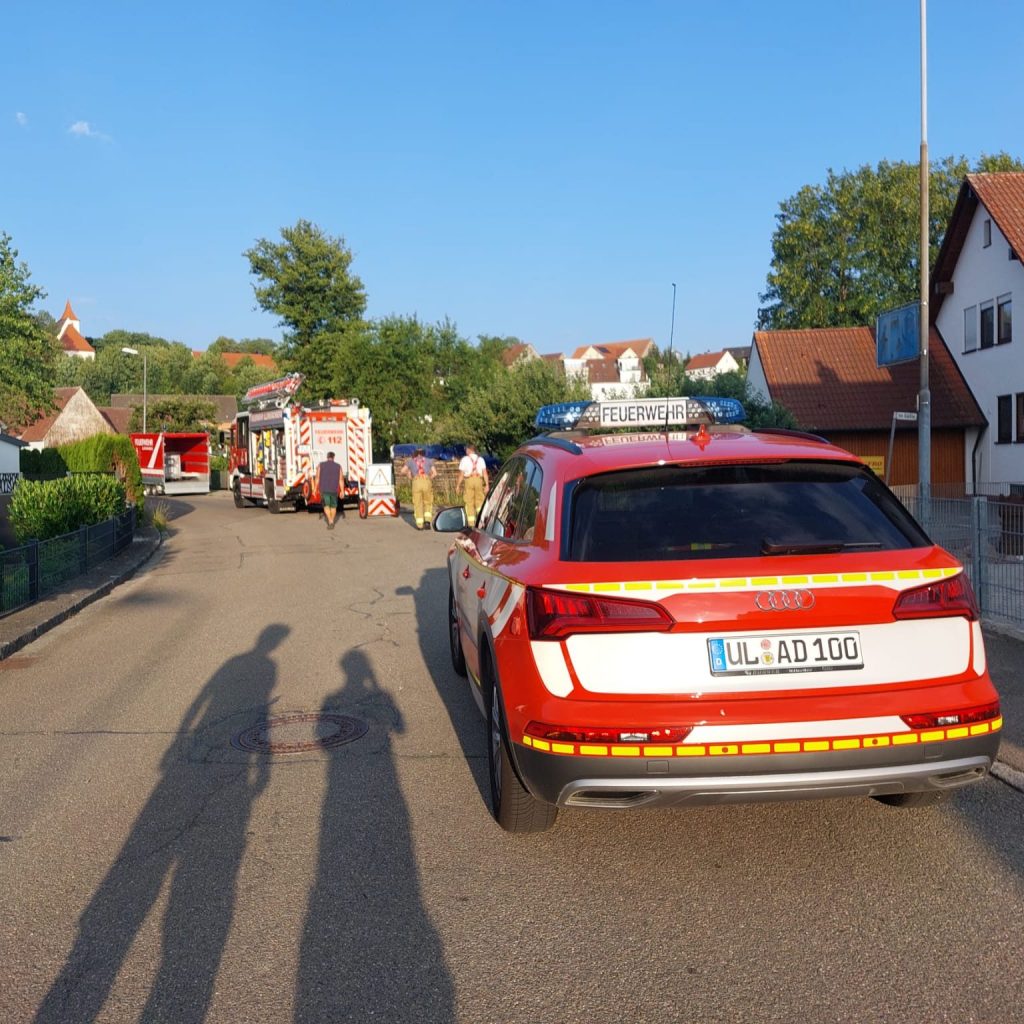 Bei dem Einsatzstichwort handelte es sich um eine Falschmeldung. Statt Wasser auf der Fahrbahn, handelte es sich um eine unbekannte Flüssigkeit, die durch einen seitlichen Zulauf in die Weihung floss. Zuerst wurde die weitere Ausbreitung der Flüssigkeit verhindert. Das Umweltamt des Alb-Donau-Kreises und die CBRN-Erkunder wurden angefordert um die Flüssigkeit zu bestimmen. CBRN steht für Chemisch, Biologische, Radiologische, Nukleare Gefahren. Die Messungen ergaben, dass es sich nicht um einen gefährlichen Stoff handelte und somit bestand keine Gefahr für die Umwelt.